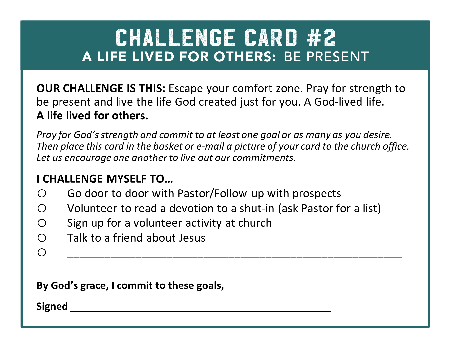 This month, the particular focus of the God-lived life is a life lived for others, a life of generosity. God allows us the opportunity to serve and love one another, especially those who are part of our communities. Our challenge card this month will focus on being a good neighbor. What makes someone a good neighbor? How can you show God’s love to others by being a good neighbor? How can our church be a good neighbor to our community? How can we be present for others?